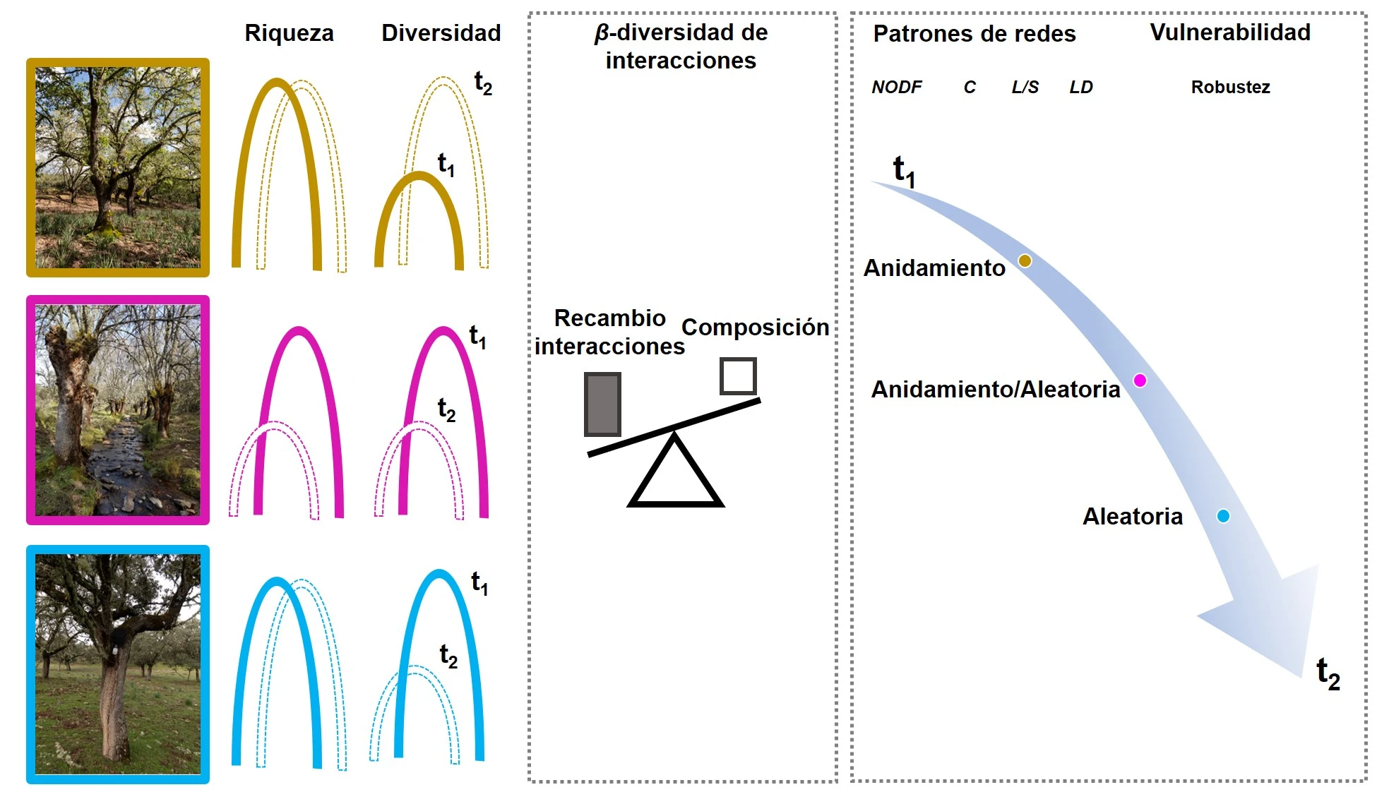 En este trabajo demostramos que la metodología de redes ecológicas es válida para inferir la vulnerabilidad de las comunidades saproxílicas de las oquedades en distintos escenarios y escalas temporales. Para ello estudiamos la variación interanual en los patrones de diversidad y de interacciones ecológicas de las comunidades de escarabajos saproxílicos que habitan las oquedades arbóreas de los tres principales tipos de bosque mediterráneo del Parque Nacional de Cabañeros. Además, simulamos potenciales escenarios de extinción basados en una pérdida en la idoneidad de las oquedades.